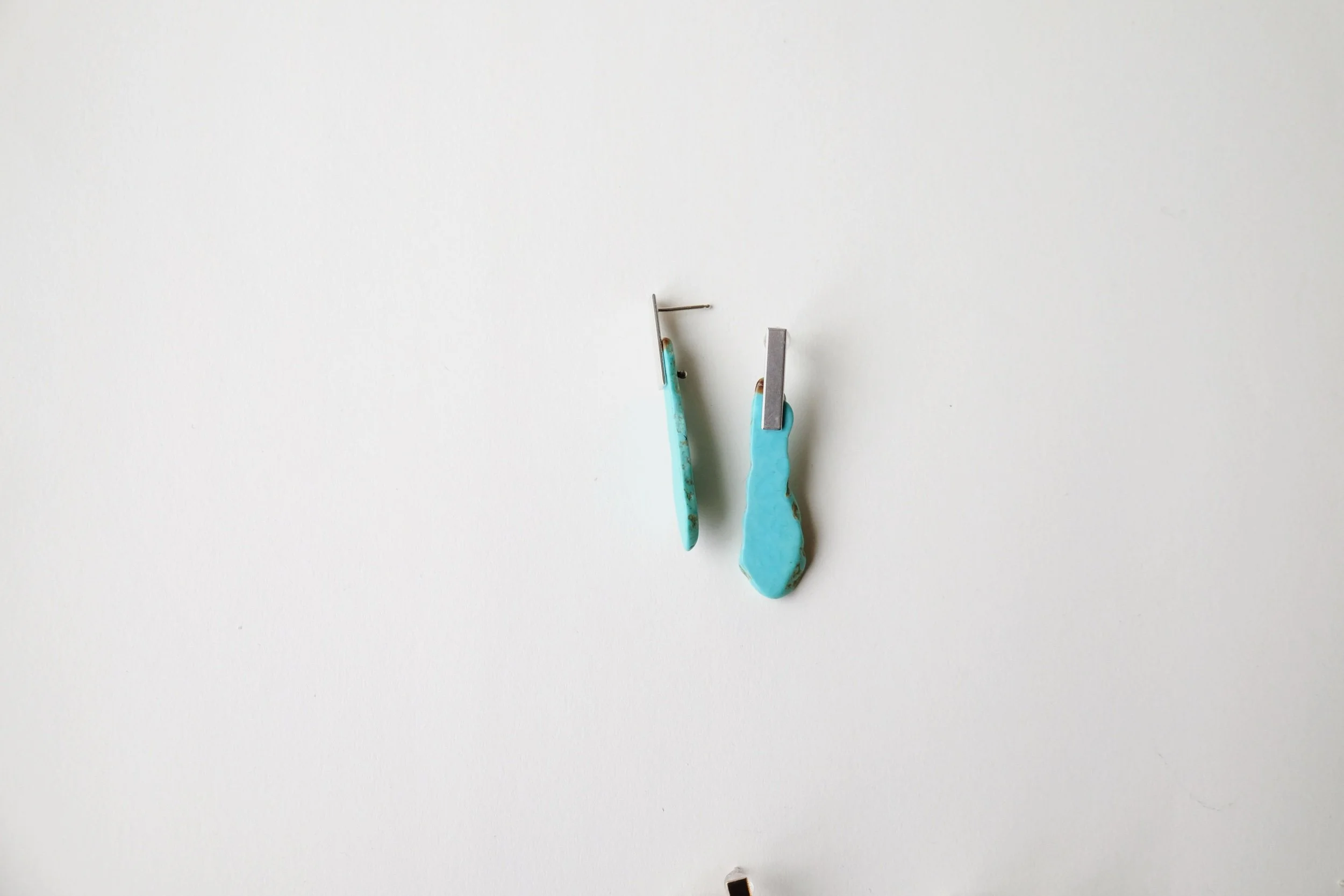 A nugget of Cumpas Turquoise sliced in half and fixed behind a Sterling bar with subtle swaying movement. Model is wearing the same style with a different shape/size of stone but the bar is the same 1”.